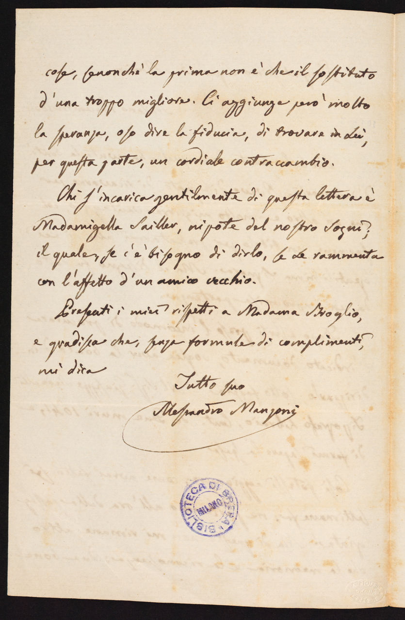 Chi s’incarica gentilmente di questa lettera è Madamigella Sailler, nipote del nostro Rosmini, il quale, se c’è bisogno di dirlo, le si rammenta con l’affetto d’un amico vecchio.